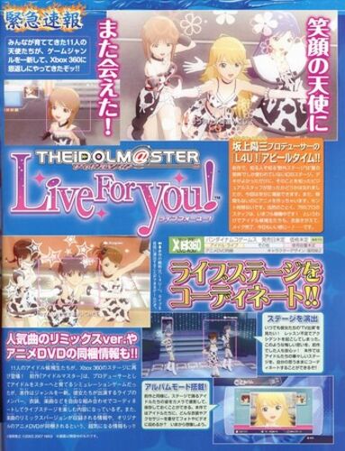 xbox360ソフトとなる予定のアイドルマスター新作(というかファンディスクというべきか)『Live For You』開発順調とのことで、めでたい限りです。時間もないくせになぜかアニメがついてくるそうで、「アレはさっくり黒歴史行きか」などといらぬ勘ぐりもして…